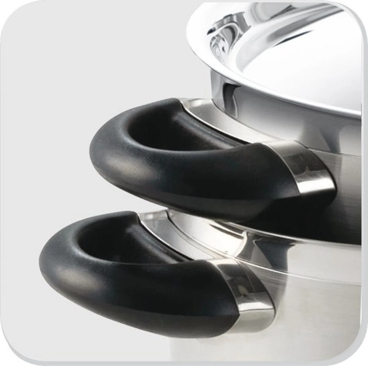 Ruimtebesparend doordat de pannen gemakkelijk in elkaar passen