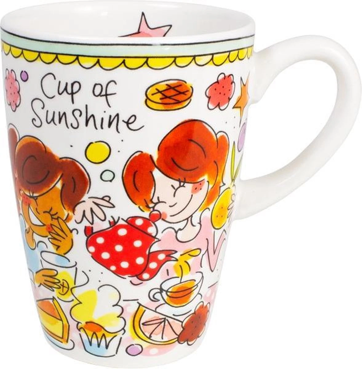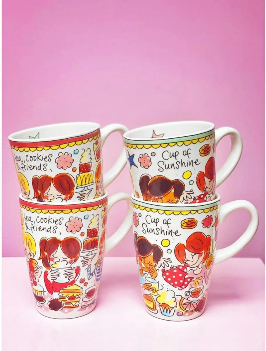 Deze grote Blond Amsterdam XL beker is onderdeel van de welbekende Even Bijkletsen serie en heeft een inhoud van 500 ml. De rand van de beker heeft een mint kleur, wat onderdeel is van deze vernieuwde lijn. De mok staat vol met herkenbare en vrolijke illustraties en aan de binnenkant staat een roze ster. De aardewerk beker is perfect voor groot glas thee of warme chocolademelk met slagroom. Ontdek de rest van het vrolijke Blond Amsterdam servies en alle andere koppen en mokken in onze webshop.