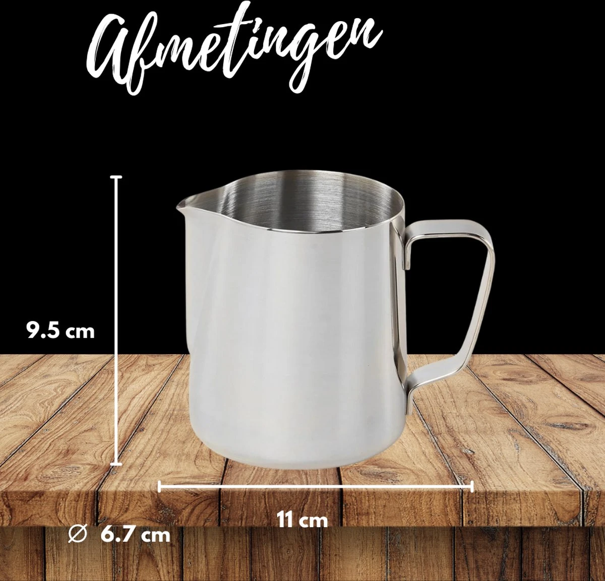 Iedereen wil toch de lekkerste koffie? Met dit melk opschuimkannetje gemaakt van roestvrijstaal gaat dat zeker lukken. Test je barista skills met deze 350 ml melkkan. Maak de mooiste en lekkerste cappuccino’s, latte macchiato’s. Nu inclusief cappuccino sjablonen voor de finishing touch.