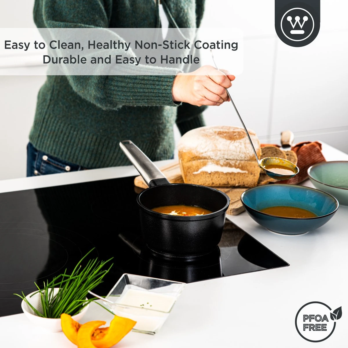 Alle pannen (koekenpannen, kookpannen, hapjespannen, wokpannen, grillpannen en steelpannen) en pannensets van de Westinghouse Performance Series Cookware hebben een PFOA-vrije anti-aanbaklaag dat geen gifstoffen bevat. Tevens komen er geen schadelijke stoffen vrij tijdens het koken dankzij de speciale QuanTanium coating. Gegarandeerd veilig en smakelijk koken dus!